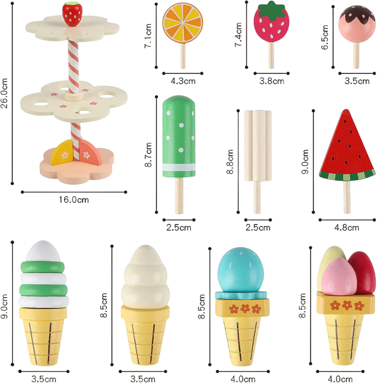 Dzięki wytrzymałemu drewnianemu materiałowi zabawka wytrzyma intensywne użytkowanie i stanie się długoterminowym towarzyszem każdego małego kucharza lub sprzedawcy. Realistyczne kolory i wykonanie lodów i owoców przyciągną dzieci w każdym wieku i wspierają ich chęć do kreatywnej zabawy.