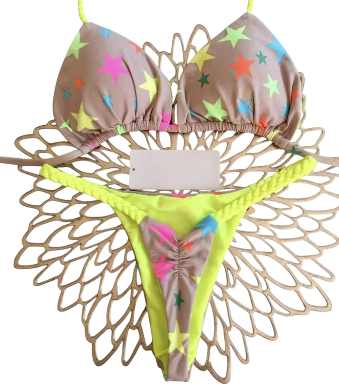 Ten dwuczęściowy komplet kostiumu kąpielowego przypadnie do gustu każdej kobiecie poszukującej wyjątkowego wyglądu na lato. Krój stringów gwarantuje minimalne zakrycie , pozwalając cieszyć się maksymalną swobodą i idealnymi warunkami do opalania. Biustonosz typu trójkąt jest łatwy do dopasowania i podkreśla sylwetkę. Wzorzysty materiał nada zabawny i jednocześnie elegancki efekt , który wyróżni się na każdej sylwetce. Szybkoschnący materiał jest praktyczny do codziennego użytku w wodzie i na słońcu . Dzianinowe sznurowadła dopełniają szczegółowy wygląd i gwarantują wygodę noszenia przez cały dzień.
