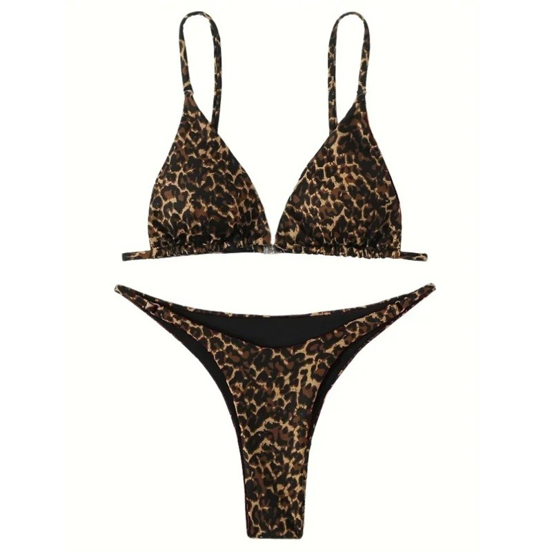 Dwuczęściowy damski strój kąpielowy bikini z trójkątnym topem w panterkę, regulowanymi ramiączkami i stringami. Strój kąpielowy na lato