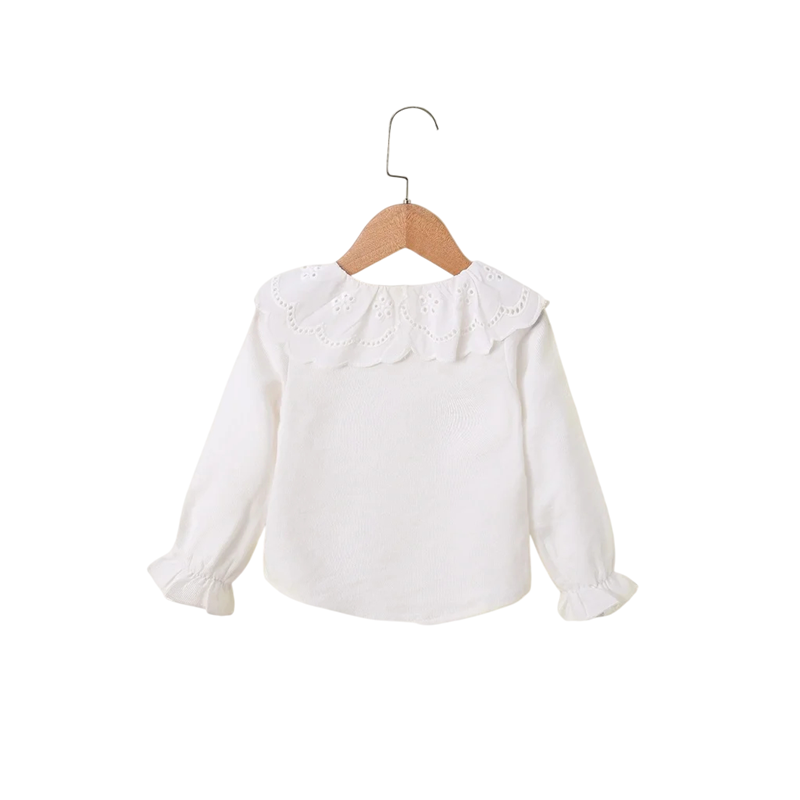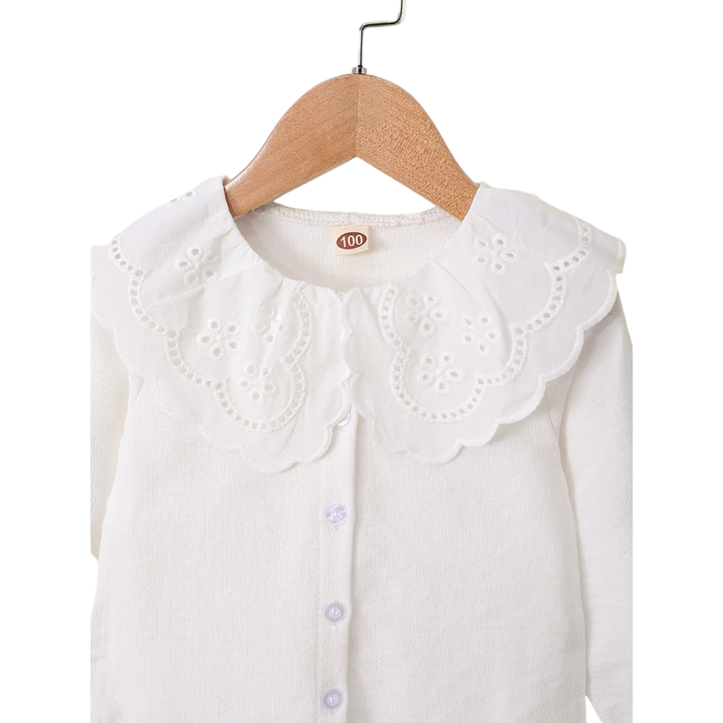 Dziecięca dziewczęca koszulka z długim rękawem Biały top z koronkowym ażurowym kołnierzykiem i guzikami Styl koreański Jesienne ubrania dla niemowląt Poliester