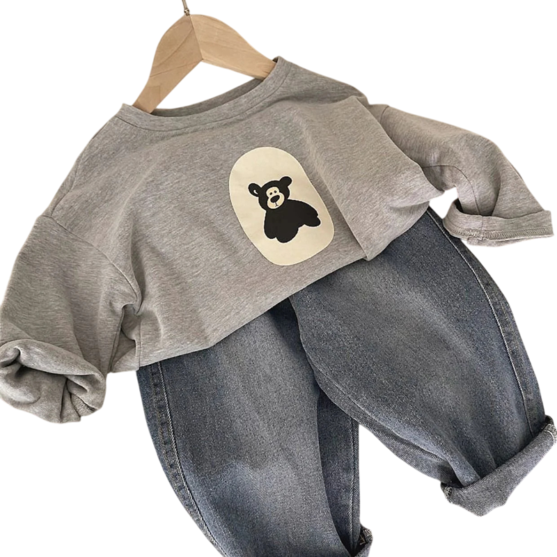 Urocza dziecięca koszulka z długim rękawem z nadrukiem misia. Wygodny luźny krój, okrągły dekolt, odpowiednia na wiosnę i jesień, dostępna w różnych kolorach. Pełny opis