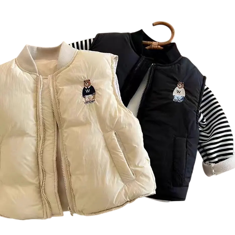 Stylowa dziecięca zimowa kamizelka z kołnierzem baseballowym, zamkiem i kieszeniami. Ciepła kurtka bez rękawów z uroczym wyhaftowanym misiem, idealna na zimę. Pełny opis
