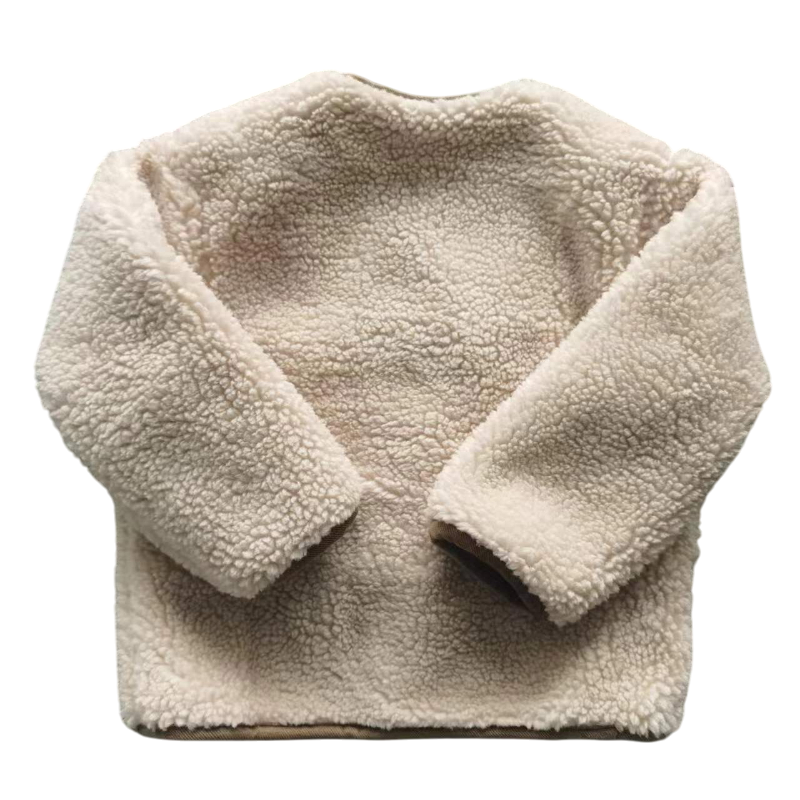 Dwustronna dziecięca zimowa kurtka z patentami, kieszeniami i pluszową stroną dla ciepła. Druga kraciasta strona oferuje styl i zmienność na zimowe noszenie. Pełny opis