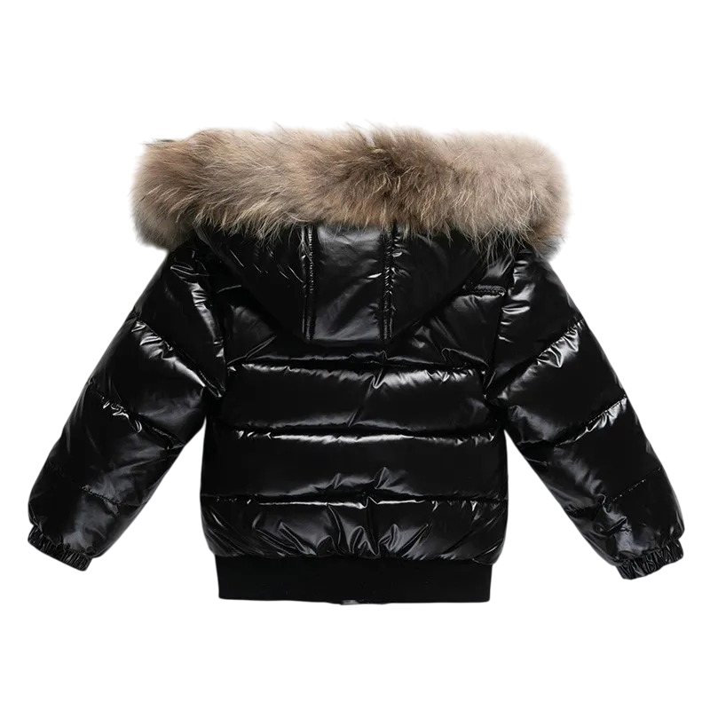 Ciepła dziecięca zimowa kurtka z kapturem z futerkiem, kieszeniami oraz połączeniem puchu, bawełny i włókna poliestrowego. Świetny wybór na zimową pogodę. Pełny opis