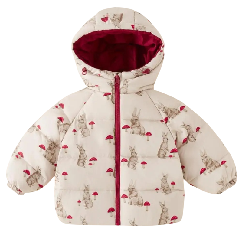 Dziecięca zimowa kurtka unisex z motywem królików na zamek błyskawiczny z kapturem Ciepłe włókno poliestrowe Zimowa pikowana kurtka dla chłopców i dziewcząt