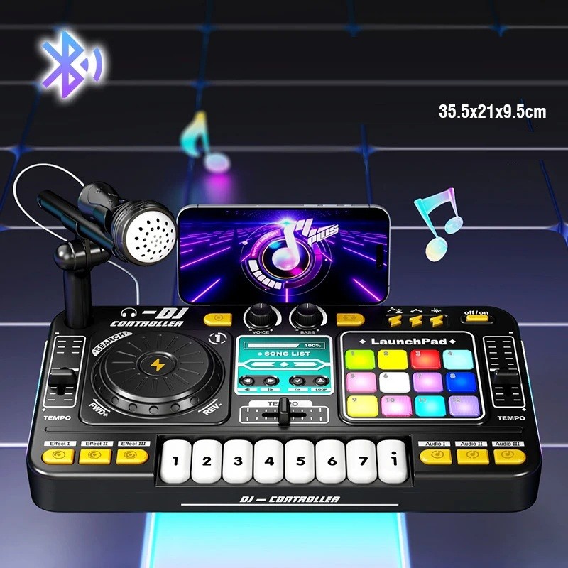 Dziecięcy stół muzyczny 35,5 x 21 x 9,5 cm Efekty świetlne klawisze obrotowy talerz mikrofon stojak na telefon i połączenie przez Bluetooth
