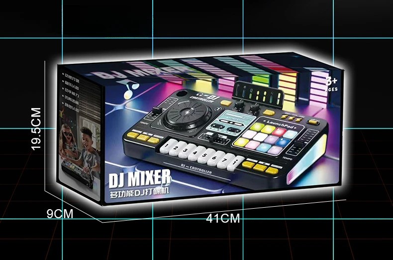 Model ma kompaktowe wymiary 35,5 x 21 x 9,5 cm i jest idealny na stół lub dziecięcy kącik do pracy. Podświetlenie tworzy płynne „oddychające” przejścia kolorów i towarzyszy rytmowi, co zapewnia wyraźny efekt wizualny. Dzieci mogą zmieniać jasność świateł, wybierać kolory, dostosowywać tempo i głośność oraz aktywować różne efekty dźwiękowe. Obrotowy talerz umożliwia przewijanie do przodu i do tyłu oraz trzy różne efekty ruchu.