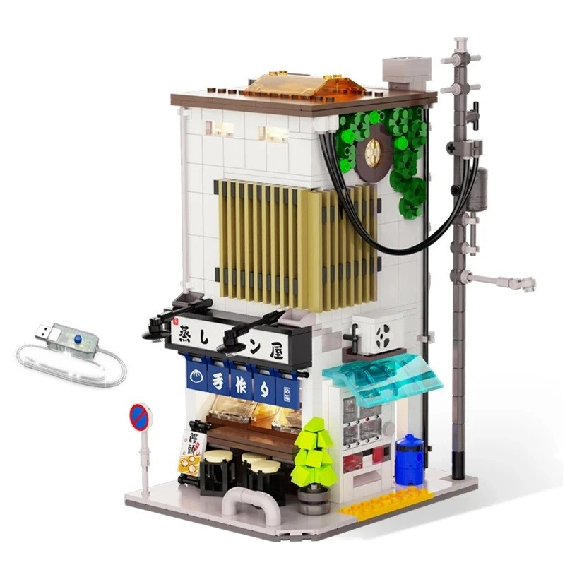 Dziecięcy zestaw konstrukcyjny dwupoziomowego japońskiego sklepu z parowymi pierożkami, 1108 elementów, szczegółowe wnętrze, oświetlenie LED USB