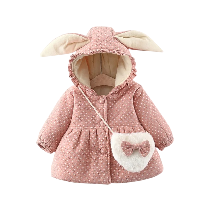 Urocza dziewczęca zimowa kurtka z króliczymi uszami, marszczonym kapturem i zapięciem na zatrzaski. W zestawie znajduje się pluszowa torebka jako prezent, idealna na zimę. Pełny opis