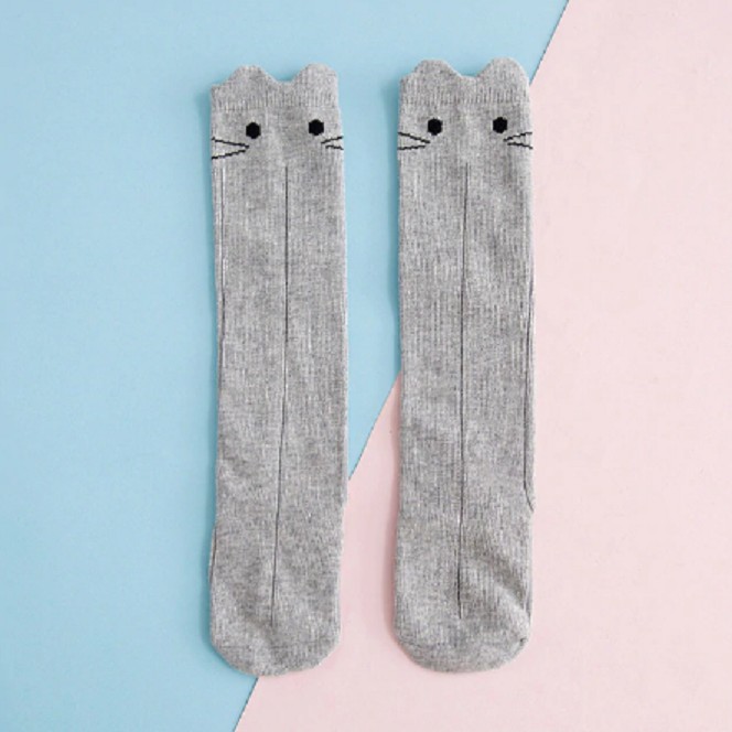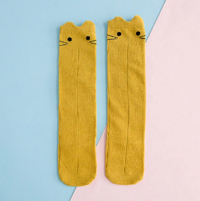 Podkolanówki mają wszyte oczy z wąsami i uszami.