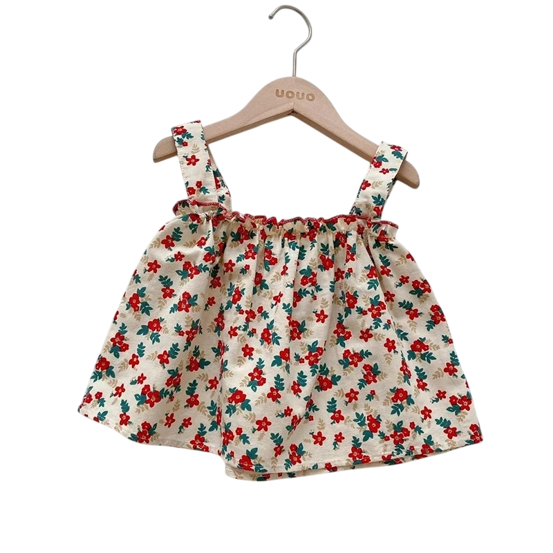 Strona główna Strona główna Odzież i akcesoria Ubranka dla dzieci Ubrania dla niemowląt Odzież dziewczęca dla niemowląt Dziewczęce komplety dla niemowląt Dziewczęcy letni zestaw Kwiatowy top z szerokimi ramiączkami i niebieskie szorty Marszczenie Okrągły dekolt Wygodny komplet