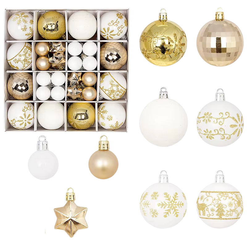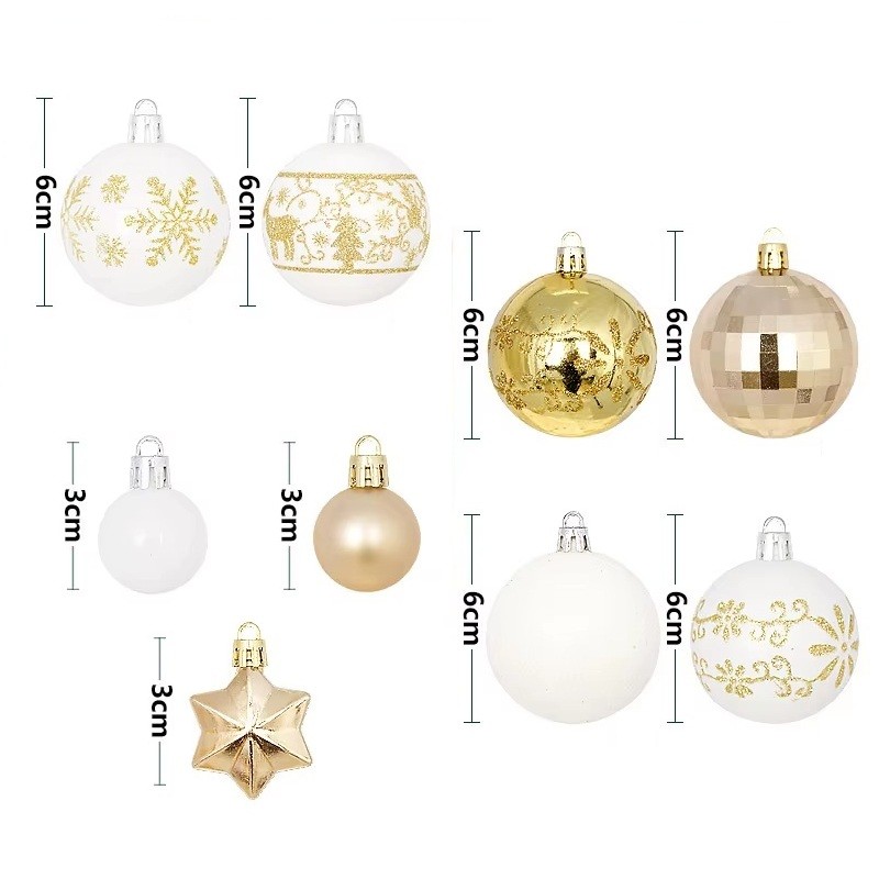 Poszczególne ozdoby mają średnicę 3 - 6 cm, co jest idealnym rozmiarem do równomiernego rozmieszczenia po całej choince. W zestawie znajdują się kształty kul i gwiazd, które należą do tradycyjnych motywów świątecznych. Biało-złote wykończenie wygląda czysto i elegancko. Różne rozmiary ozdób tworzą głębię i efekt przestrzenny. Ozdoby świąteczne nadają się nie tylko do dekoracji choinki, ale także do dekoracji wieńców, stołów świątecznych, półek, okien lub świątecznych aranżacji w wnętrzach. Dzięki lekkiej konstrukcji łatwo się je wiesza i są odpowiednie do corocznego użytku.