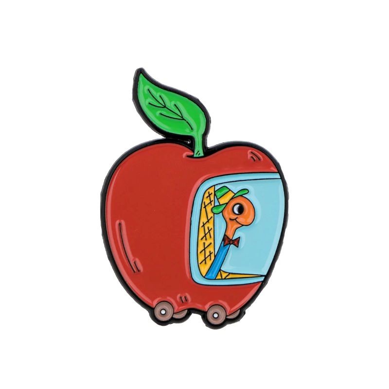 Emaliowane wykonanie zapewnia gładką powierzchnię i wyraźne kolorowe oddzielenie poszczególnych części motywu. Kolorowa kombinacja czerwonego jabłka, zielonego liścia i wewnętrznej ilustracji nadaje broszce żywy wygląd. Wymiary około 2 × 3,7 cm czynią z niej praktyczny dodatek, który można łatwo łączyć z innymi odznakami lub nosić samodzielnie.