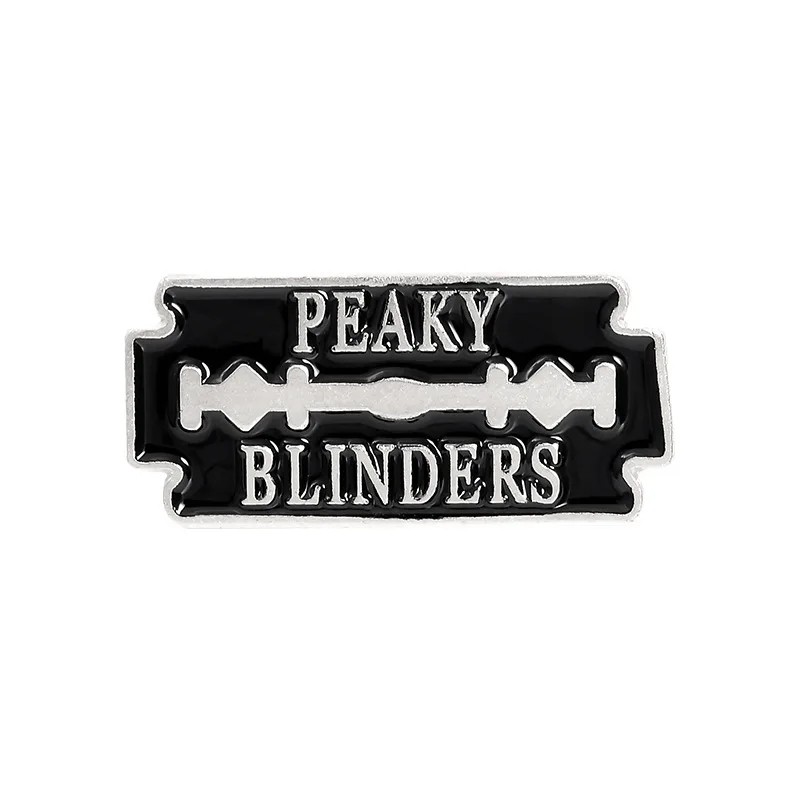 Emaliowana broszka z motywem Peaky Blinders przyciąga uwagę wyrazistym graficznym wykonaniem inspirowanym ikonicznym stylem wizualnym. Design łączy napis „Peaky Blinders“ z motywem żyletki, który jest centralnym elementem całego odznaku. Dzięki prostemu, ale kontrastowemu wykonaniu motyw jest dobrze czytelny i łatwo rozpoznawalny.