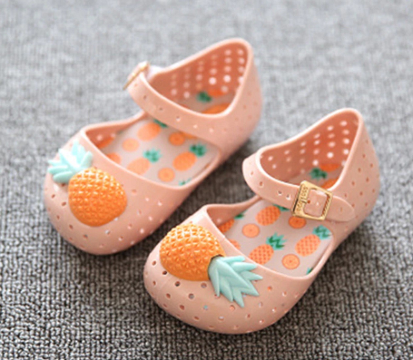 Dziewczęce gumowe sandały ozdobione mini ananasem pokochają wszystkie małe dziewczynki.