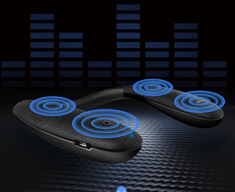 Użycie głośnika jest bardzo proste – po włączeniu wystarczy sparować go z telefonem, telewizorem lub innym kompatybilnym urządzeniem za pomocą Bluetooth. Przyciski sterujące umożliwiają regulację głośności oraz odbieranie połączeń bez konieczności sięgania po telefon. Dzięki konstrukcji na szyi dźwięk kierowany jest bezpośrednio do uszu, nie zakłócając otoczenia. Ten głośnik nadaje się do użytku domowego, oglądania filmów, grania w gry oraz codziennych aktywności. Łączy komfort, funkcjonalność i nowoczesne bezprzewodowe słuchanie w jednym kompaktowym urządzeniu.