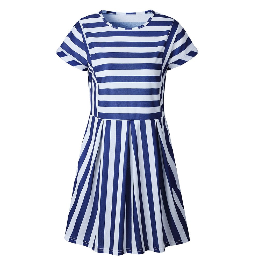 Letnia damska sukienka w paski z krótkimi rękawami.