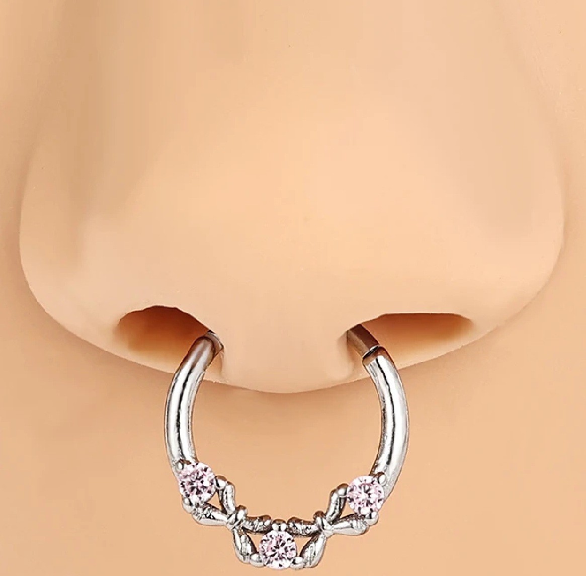 • Kulatý srebrny piercing z różowymi kamieniami