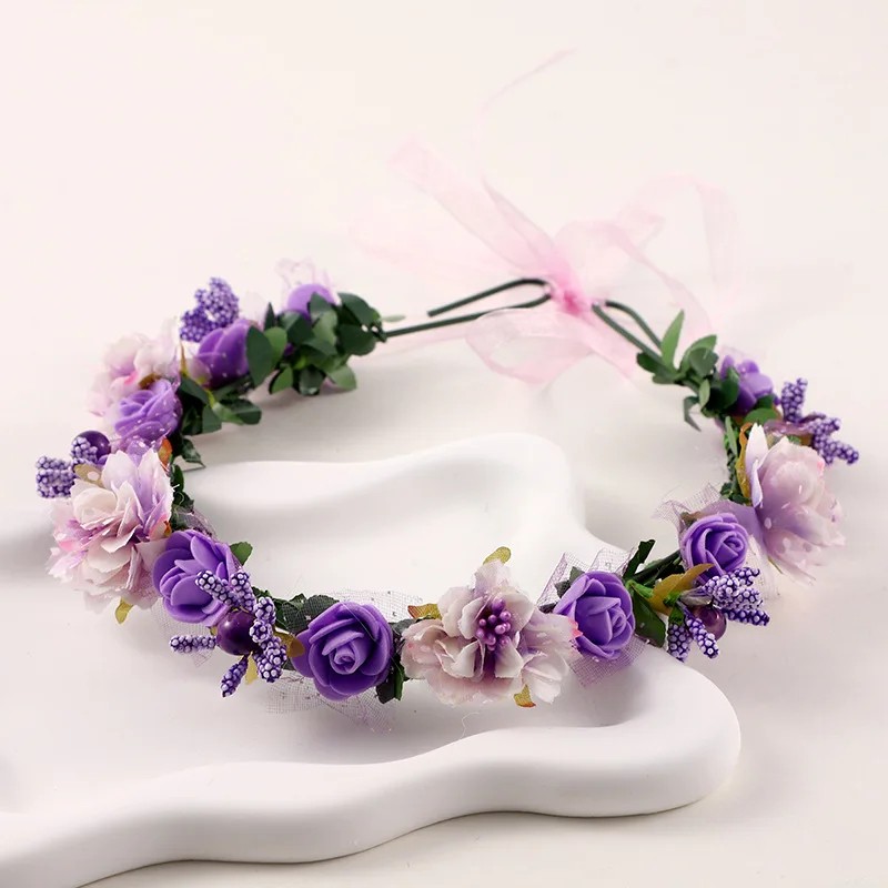 Kwiatowa korona do włosów w fioletowych odcieniach Delikatne różowe różyczki i ozdobne kwiaty Romantyczna ozdoba do włosów z dekoracyjną wstążką
