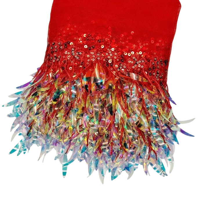 Dekoracyjna siatkowa wstążka z kwiatowym wzorem, cekinami i frędzlami jest wyrazistym tekstylnym dodatkiem odpowiednim do szycia, zdobienia odzieży oraz kreatywnych projektów. Połączenie siatkowej struktury, błyszczących cekinów i ruchomych frędzli tworzy atrakcyjny efekt dekoracyjny, który doskonale nadaje się do kostiumów tanecznych, odzieży scenicznej lub stylowych dekoracji. Dzięki wymiarom szerokość 18 cm i długość 182 cm wstążka zapewnia wystarczającą ilość materiału do większych projektów oraz szczegółowego zdobienia.