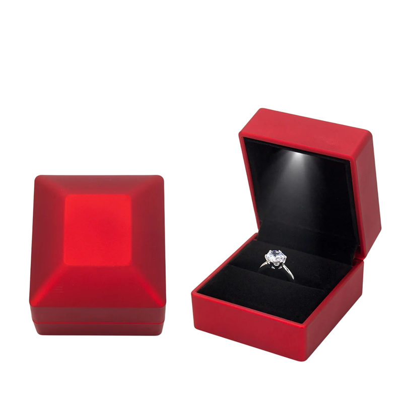 Pudełko dostępne jest w kilku eleganckich wariantach kolorystycznych, które podkreślają styl każdej biżuterii. Wewnętrzna część pokryta jest welurowym wykończeniem, które chroni pierścionek przed uszkodzeniem. Ten model jest popularny na prezenty zaręczynowe, okazje ślubne oraz luksusowe prezentacje biżuterii w butikach. Oświetlenie LED tworzy wrażenie luksusu, dzięki czemu nawet mały prezent staje się niezapomniany.