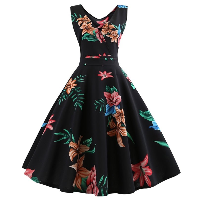 Damska sukienka bez rękawów w popularnym stylu. Stylowy nadruk.