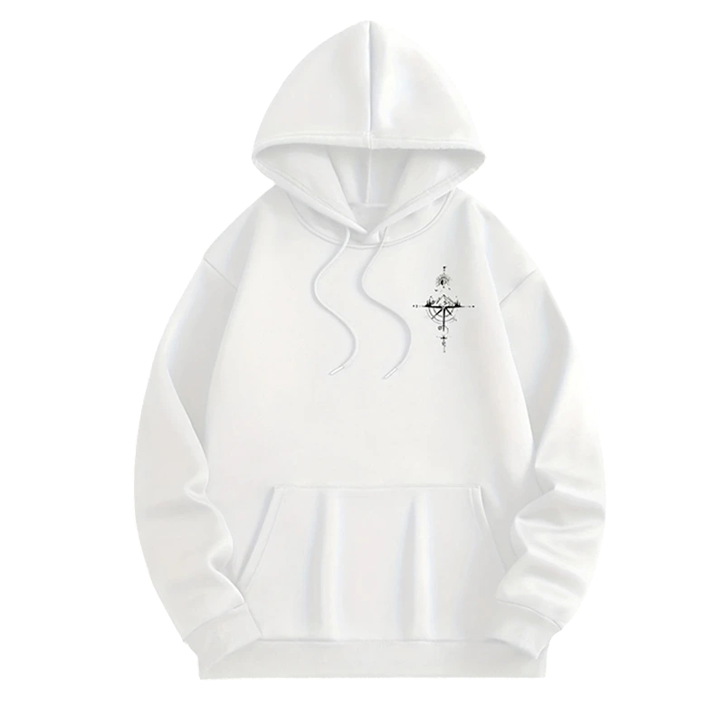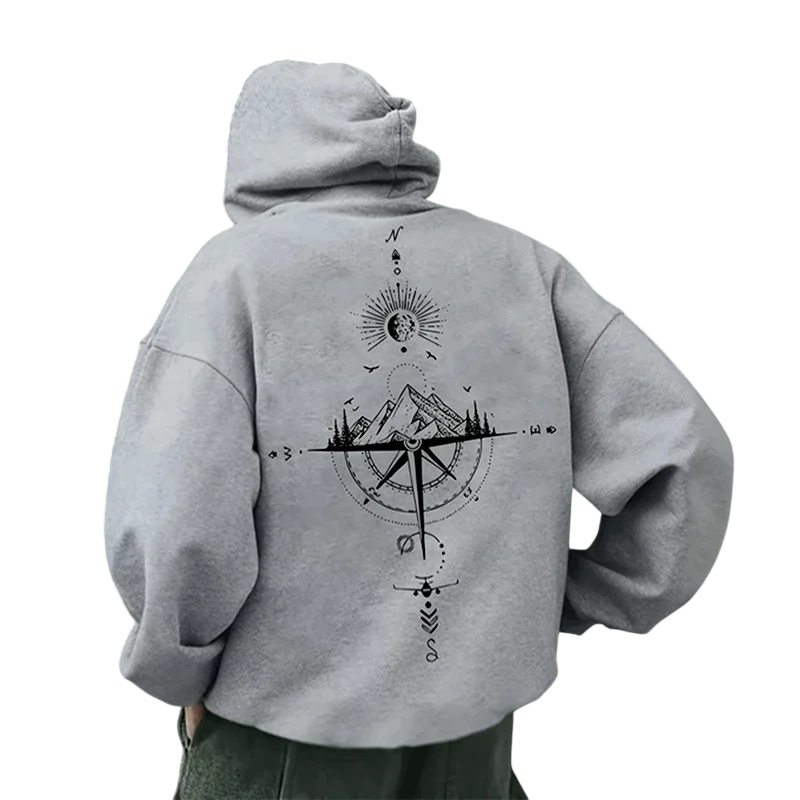 Stylowa męska bluza z wysokiej jakości poliestru z kapturem, kieszeniami i delikatnym wzorem kompasu z przodu i z tyłu. Idealna na czas wolny. Pełny opis