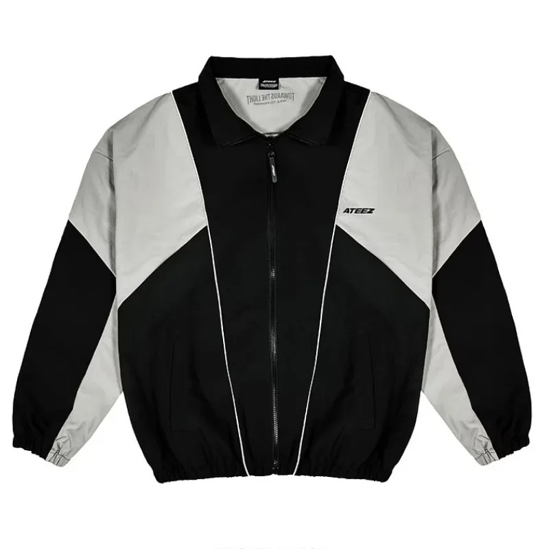 Strona główna Strona główna Odzież i akcesoria Odzież męska Kurtki i płaszcze męskie Kurtki męskie wiosenne i jesienne Męska czarno-biała kurtka sportowa z nadrukiem graficznym z tyłu Zapięcie na zamek Kołnierz Długie rękawy Kurtka przejściowa do miasta