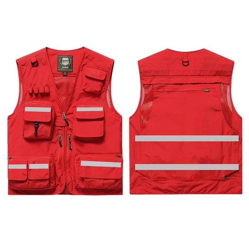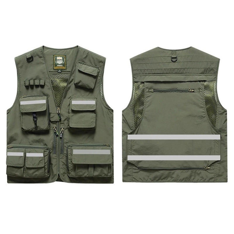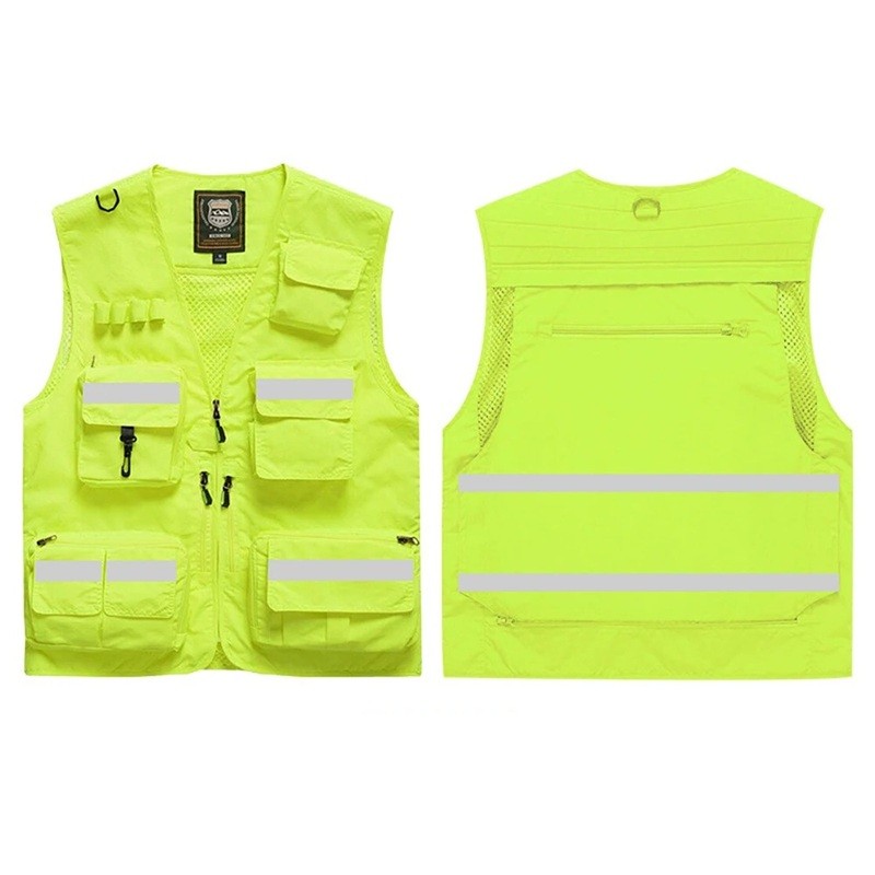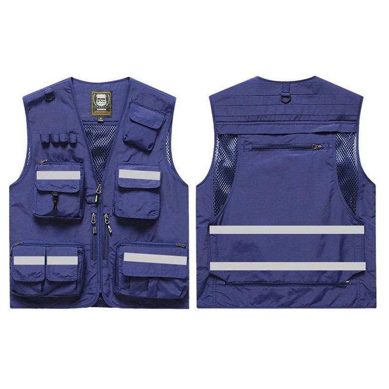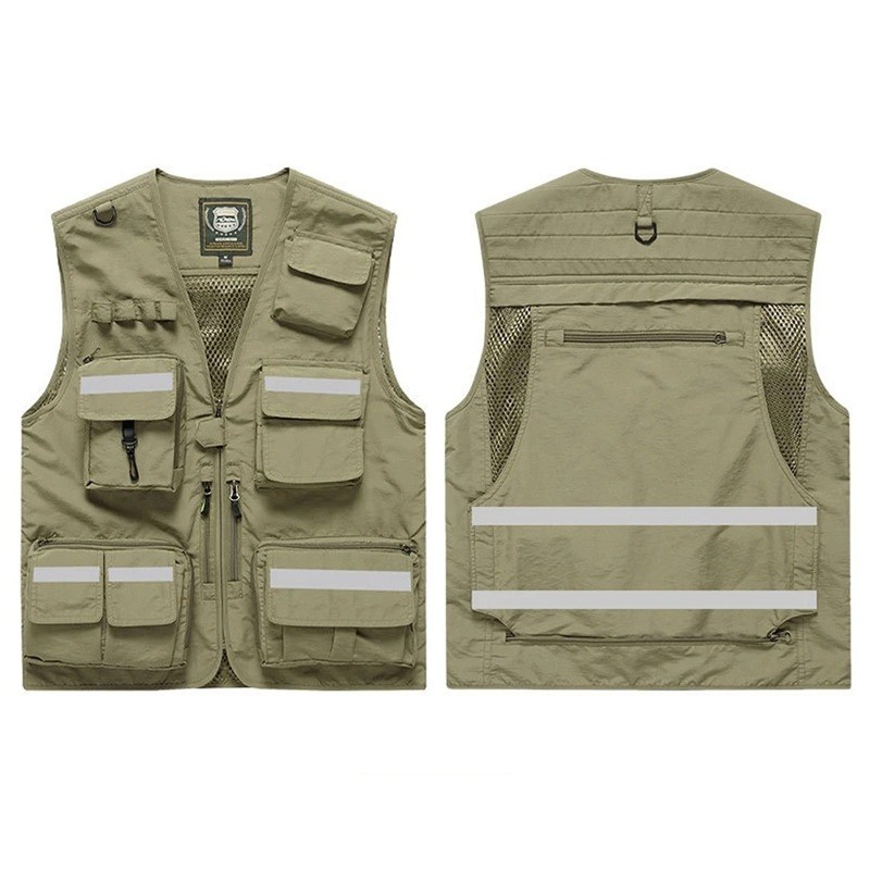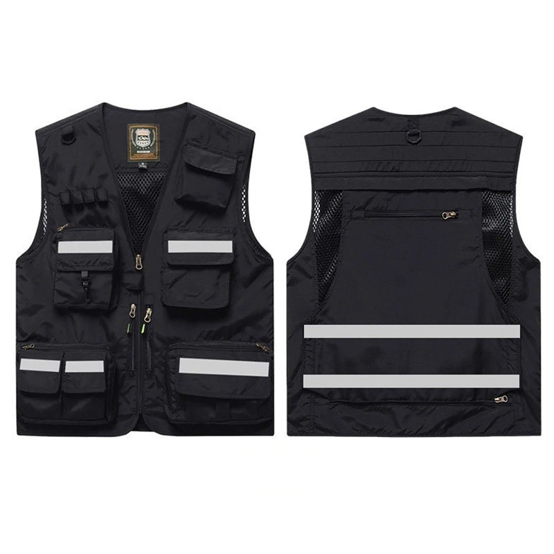 Męska kamizelka z odblaskowymi paskami i kieszeniami na zamek z poliestru do pracy, wędkowania, turystyki i aktywności na świeżym powietrzu