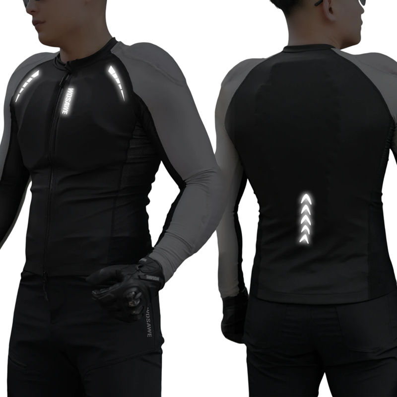 Podstawą ochrony jest odpinany ochraniacz, który znajduje się na klatce piersiowej, plecach, ramionach i łokciach. To rozwiązanie ma na celu ochronę przed upadkiem i amortyzację uderzeń podczas jazdy na motocyklu. Praktycznym elementem są odblaskowe paski na ramionach i dolnej części pleców, uzupełnione o odblaskowe logo WOSAWE, które zwiększają widoczność motocyklisty w warunkach słabego oświetlenia. Kurtka została zaprojektowana tak, aby zapewniać ochronę w kluczowych strefach, a jednocześnie pozostawać wygodna w noszeniu. Odpinane ochraniacze umożliwiają dostosowanie do indywidualnych potrzeb.