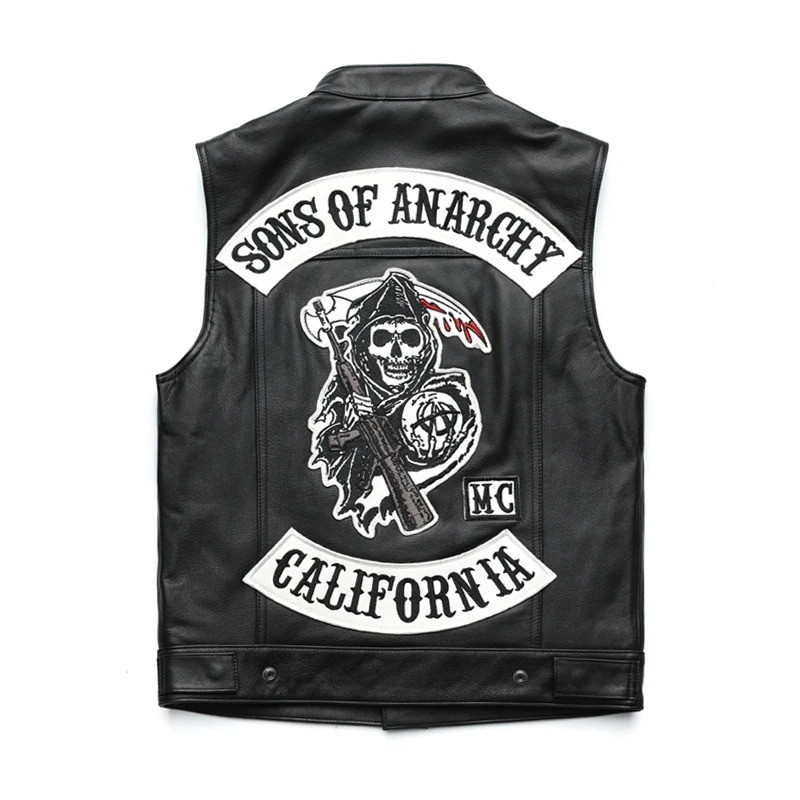 Męska motocyklowa kamizelka z nadrukiem czaszki i napisem Sons of Anarchy PU skóra czarna do jazdy na motocyklu i stylu motocyklowym