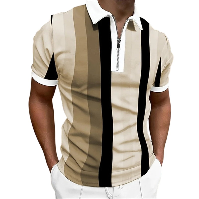 Męska polokoś z zamkiem błyskawicznym i dekoltem w kształcie V Krótki rękaw Kolorowe paski Poliester Stylowa letnia polokoś
