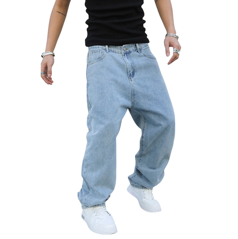 Męskie luźne niebieskie dżinsy z kieszeniami, dżins, nowoczesny krój, wygodne na co dzień