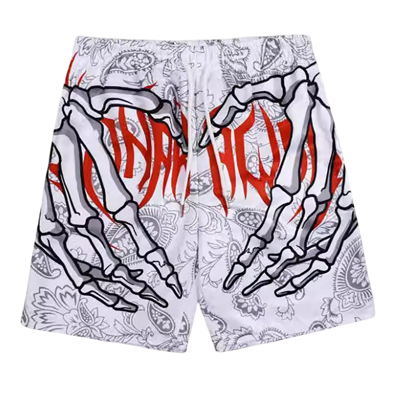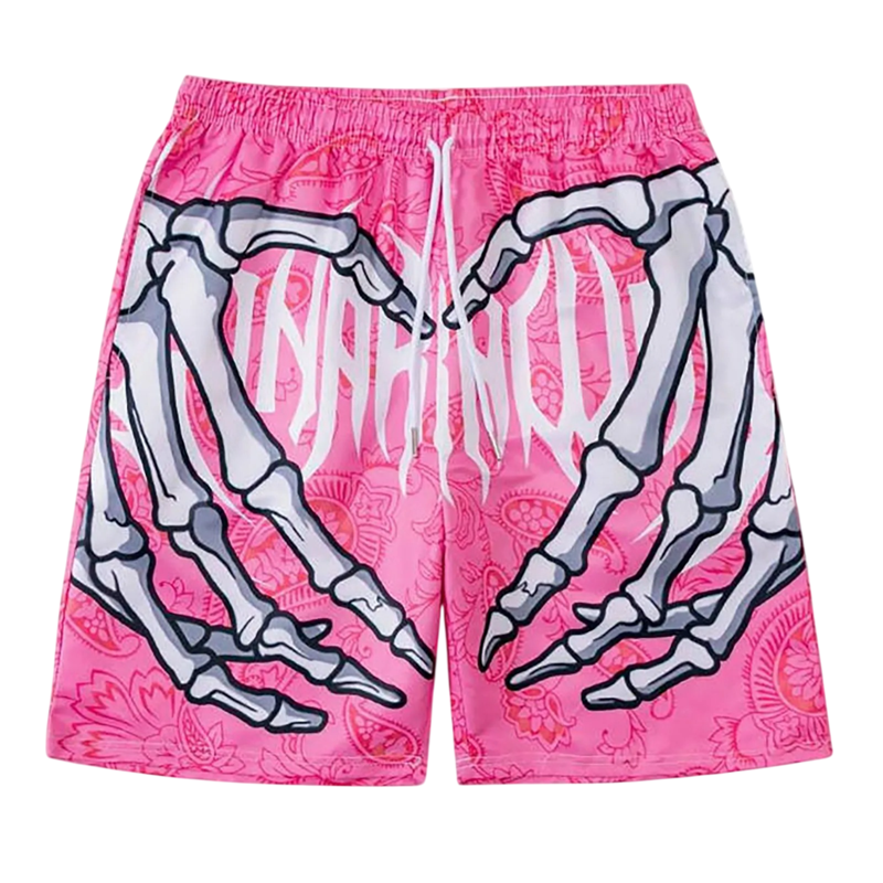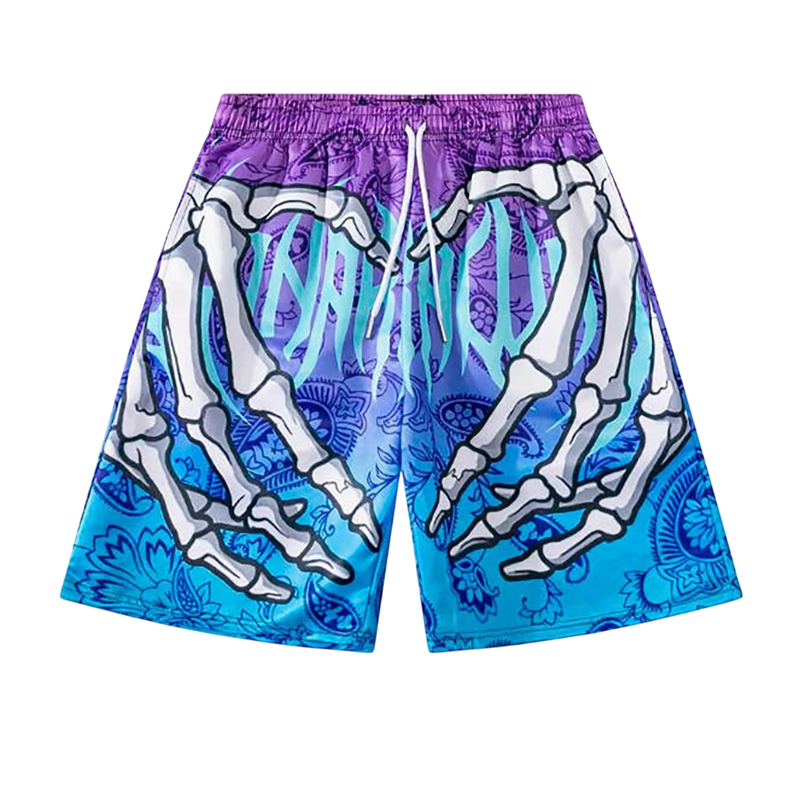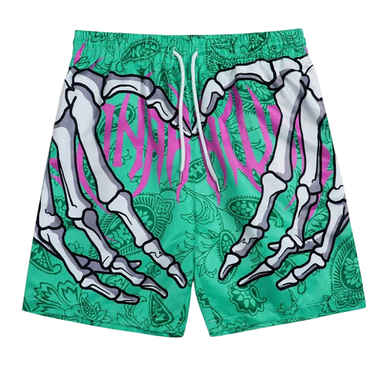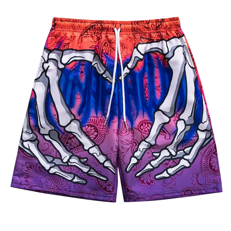 Wyraziste tęczowe kąpielówki z oryginalnym nadrukiem szkieletowych rąk i serca, elastyczny szybkoschnący materiał na lato nad wodą. Pełny opis