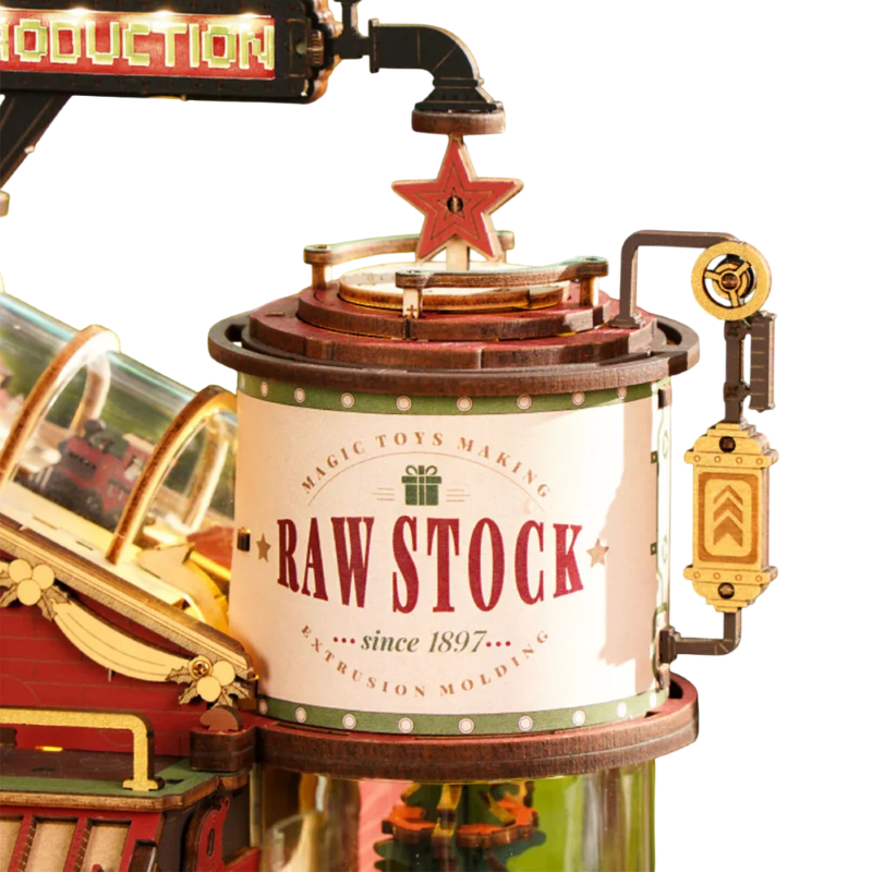 Taki luksusowy model mini fabryki prezentów oferuje wyjątkowe doświadczenie tworzenia i odkrywania. Każdy detal tej drewnianej konstrukcji jest precyzyjnie opracowany i łączy zabawna fantazję, nowoczesną technologię i tradycyjny ręczny design. Model odzwierciedla kompletny proces produkcji – od magazynowania surowców przez linie montażowe aż po pakowanie gotowych produktów. Dzięki sześciu strategicznie umieszczonym światłom LED i efektom dźwiękowym fabryka wydaje się żywa, pełna ruchu i radosnej atmosfery.