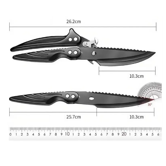 Uniwersalne narzędzie 2 w 1, łączące w sobie nożyczki kuchenne i ostry nóż , to idealny pomocnik do łatwego i szybkiego przetwarzania mięsa, drobiu lub warzyw. Wykonane z wytrzymałej, czarnej stali tytanowej o wysokiej twardości i długiej żywotności.