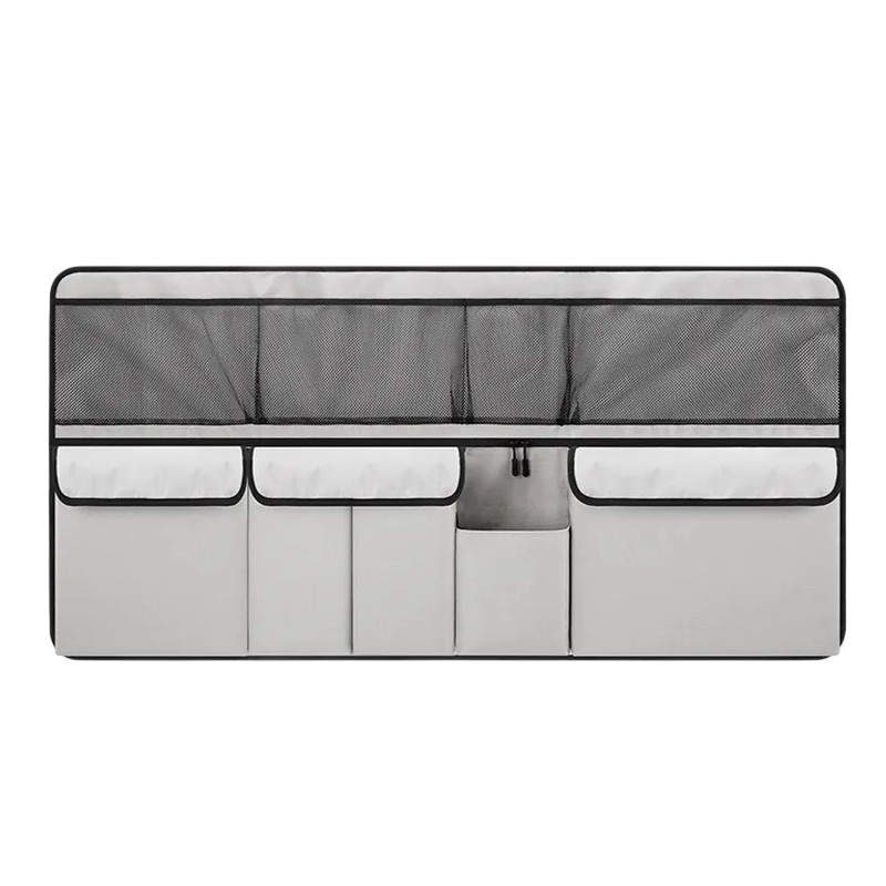 Praktyczny system przechowywania do bagażnika samochodowego z siateczkowymi i zamykanymi kieszeniami, który utrzymuje porządek i oszczędza miejsce podczas podróży samochodem. Pełny opis