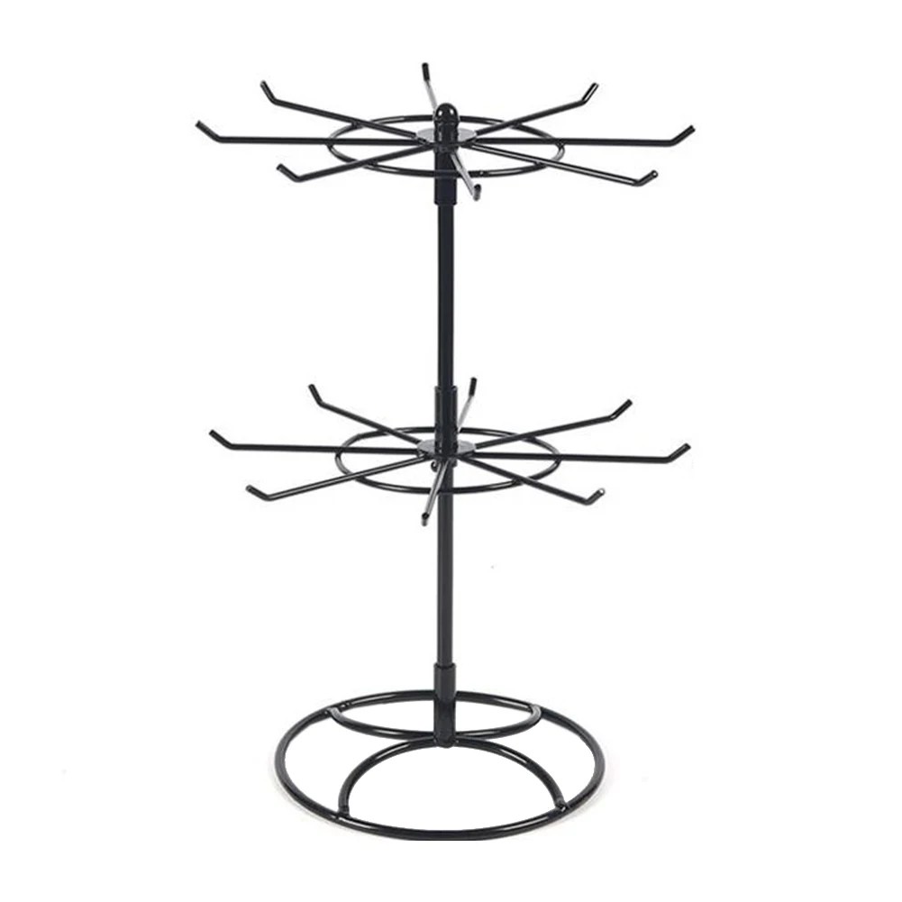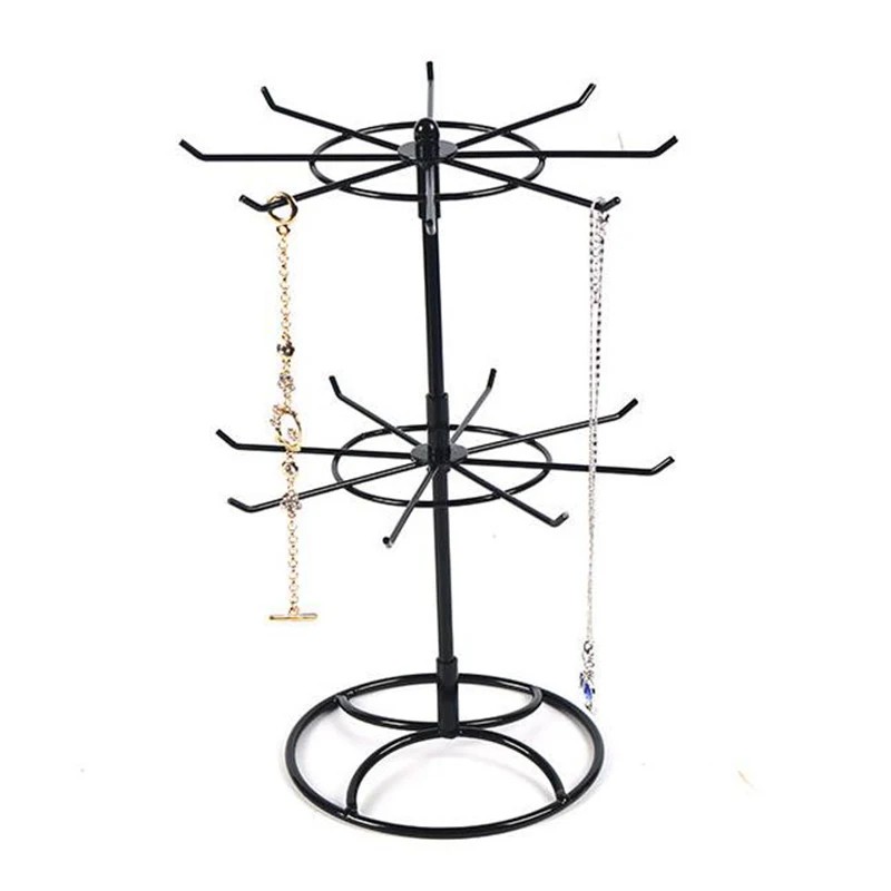 Dwupoziomowy stojak na biżuterię z obrotową konstrukcją do przejrzystego zawieszenia naszyjników, bransoletek lub zegarków. Stolikowy organizer biżuterii. Pełny opis