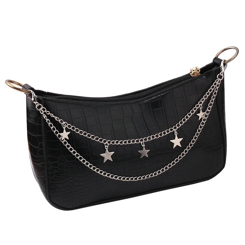 Łańcuszek ma podwójną konstrukcję, która składa się z dwóch łańcuchów o długościach 26 cm i 31 cm. Na krótszym łańcuszku znajdują się zawieszki w kształcie gwiazdek, które tworzą dekoracyjny motyw i są dobrze widoczne podczas noszenia torebki.