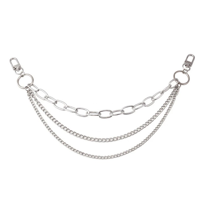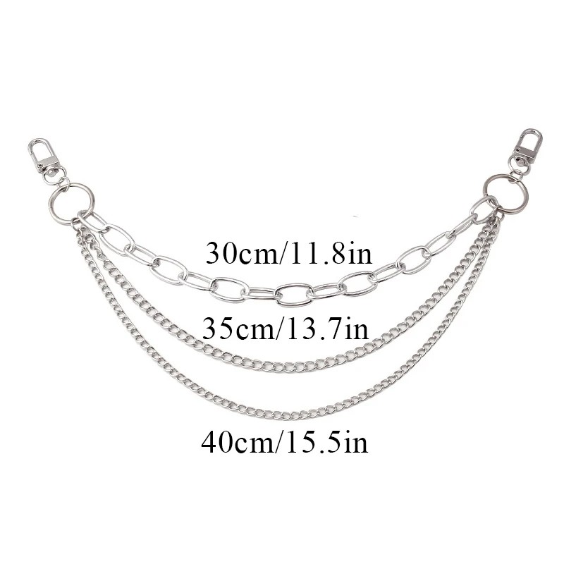 Ozdobny łańcuszek do torebki może służyć jako wyrazisty dekoracyjny dodatek, który zmieni wygląd torebki. Ten model składa się z trzech łańcuchów o różnej długości, które są połączone w jedną całość i tworzą warstwowy wygląd. Kombinacja ogniw łańcucha działa jako wyrazisty element, który jest dobrze widoczny podczas noszenia torebki.