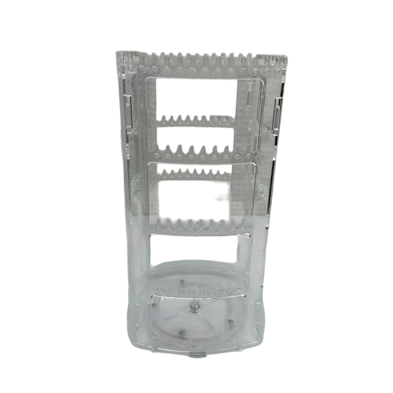 Stojak umożliwia uporządkowanie większej ilości kolczyków w jednym miejscu. Dzięki obrotowej konstrukcji stojak można łatwo obracać i wybierać biżuterię z różnych stron. Stabilna podstawa pomaga utrzymać stojak pewnie na stole podczas codziennego użytkowania. Przezroczysty materiał podkreśla samą biżuterię. Konstrukcja jest odpowiednia do domowej prezentacji lub organizacji biżuterii.