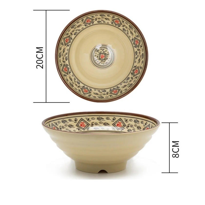 Miska wykonana jest z porcelany, która jest powszechnie stosowana w zastawie stołowej. Pojemność 1000 ml umożliwia wygodne serwowanie zup oraz makaronu. Wymiary 20 x 8 cm zapewniają stabilność i wystarczającą przestrzeń podczas użytkowania. Powierzchnia w beżowym kolorze z czarno-czerwonym wzorem ornamentalnym odpowiada wyglądowi na zdjęciu. Konstrukcja jest odpowiednia do serwowania zup noodle i innych potraw.