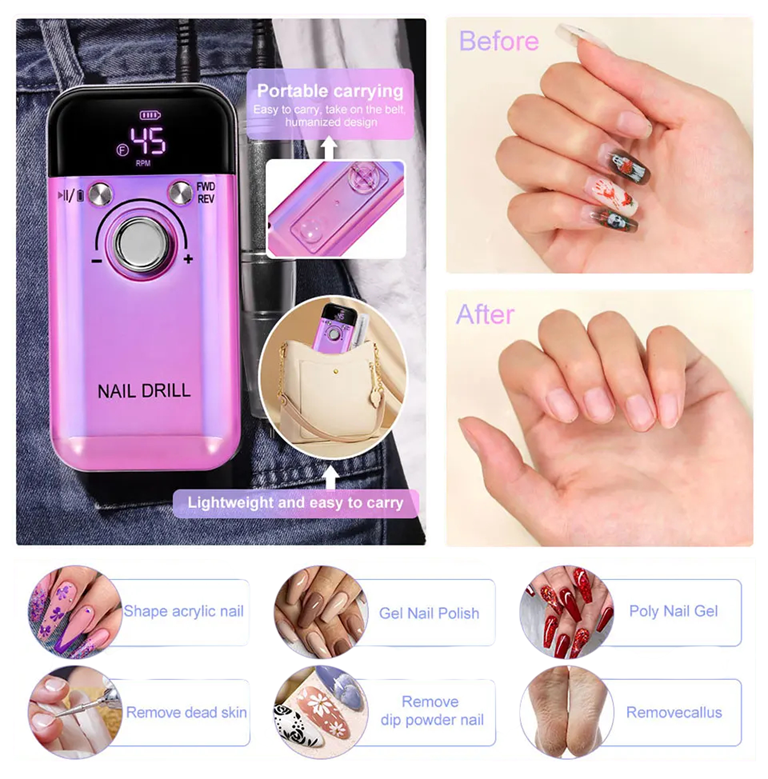 Profesjonalna elektryczna przenośna frezarka do paznokci 45000RPM 15 x 14 x 7,1 cm Ultra cicha bez wibracji USB-C ładowanie LCD wyświetlacz Ta profesjonalna elektryczna frezarka do paznokci została zaprojektowana do precyzyjnego i efektywnego opracowywania paznokci z maksymalną prędkością 45 000 obrotów na minutę (RPM). Dzięki kompaktowym wymiarom 15 x 14 x 7,1 cm jest idealna do codziennego użytku i łatwej obsługi. Ultra cicha i bez wibracji jest jej praca, co przyczynia się do komfortowego użytkowania, nawet podczas długotrwałego opracowywania paznokci. Ładowanie USB-C i inteligentny wyświetlacz LCD to nowoczesne technologie, które zapewniają maksymalny komfort i przejrzystość podczas pracy. - **Maksymalna prędkość 45 000 RPM** dla szybkiego i efektywnego opracowywania paznokci - **Kompaktowe wymiary 15 x 14 x 7,1 cm**, idealne do wygodnego i łatwego użytkowania - **Ultra cicha praca i bez wibracji**, co zapewnia komfort nawet podczas dłuższego użytkowania - **Ładowanie USB-C** dla szybkiego i wygodnego doładowania urządzenia - **Inteligentny wyświetlacz LCD** dla wygodnego monitorowania prędkości i stanu urządzenia Zawartość opakowania: - Elektryczna frezarka do paznokci - Kabel USB-C - Instrukcja obsługi - Zapasowe końcówki ścierne Ta frezarka jest idealnym wyborem dla każdego, kto szuka precyzyjnego i efektywnego narzędzia do opracowywania paznokci. Dzięki kompaktowej konstrukcji można ją łatwo przenosić i używać wszędzie. Jest idealna do użytku zarówno w profesjonalnych salonach, jak i do domowej pielęgnacji paznokci. Dzięki ultra cichej pracy i braku wibracji jej użycie jest komfortowe i nie powoduje zmęczenia, nawet podczas dłuższej pracy. Z wyświetlaczem LCD kontrola nad prędkością i stanem urządzenia jest łatwa i przejrzysta.