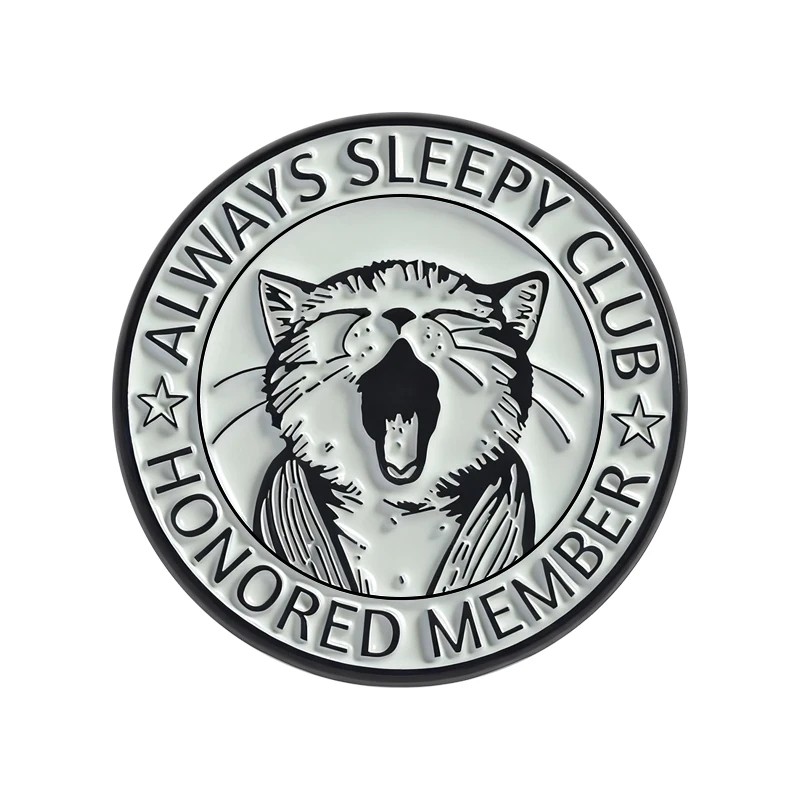 Metalowy smaltowany pin z motywem ospałej kotki i tekstem Always Sleepy Club. Dowcipny dodatek na plecak, kurtkę lub klapę. Pełny opis