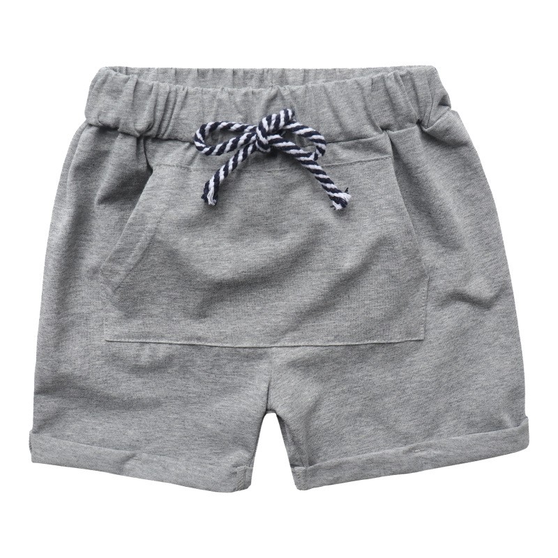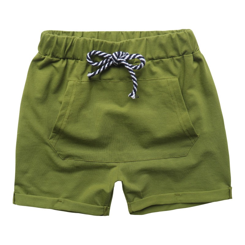 Piękne spodenki chłopięce, które z przodu posiadają dwustronną kieszeń i są wiązane sznurowadłami.