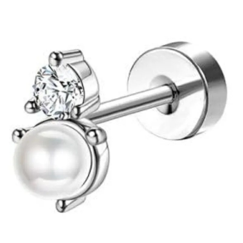 Srebrny piercing z perłą i błyszczącym kamieniem z chirurgicznej stali nierdzewnej, odpowiedni dla wrażliwych uszu, do codziennego noszenia. Pełny opis