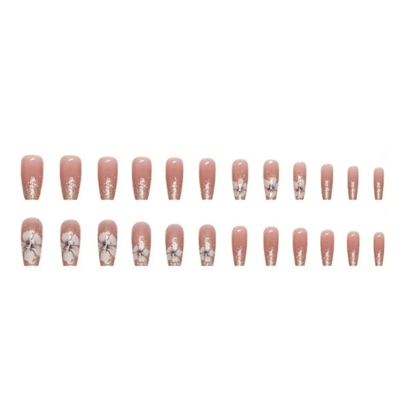 Zestaw jest świetnym rozwiązaniem dla każdego, kto chce zmienić styl rąk w ciągu kilku minut. Kwiatowe zdobienia sprawiają, że wyglądają kobieco i harmonijnie, co łatwo łączy się z różnymi strojami. Średnia długość zapewnia komfort noszenia i naturalny wygląd. Brokatowe elementy dodają paznokciom delikatnego akcentu bez przesadnej wyrazistości. Całość wygląda schludnie, stylowo i ponadczasowo.