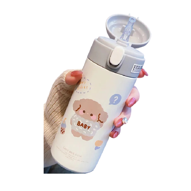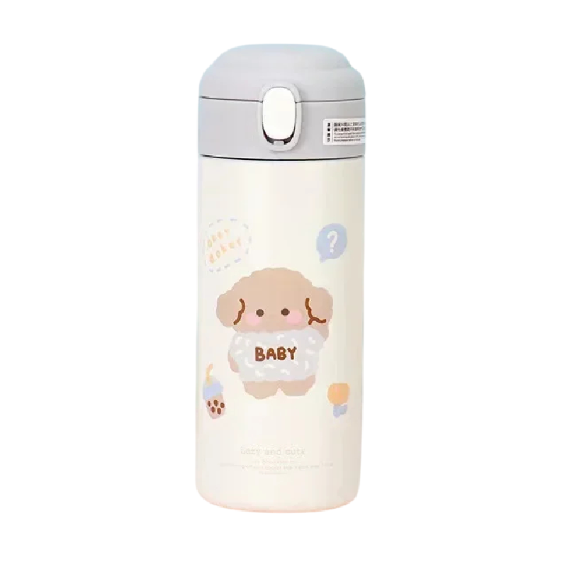 Stalowa termos z słomką i przyciskiem 380 ml próżniowa 18 x 6,5 cm kremowa z dziecięcym motywem zwierząt do picia w podróży i do szkoły