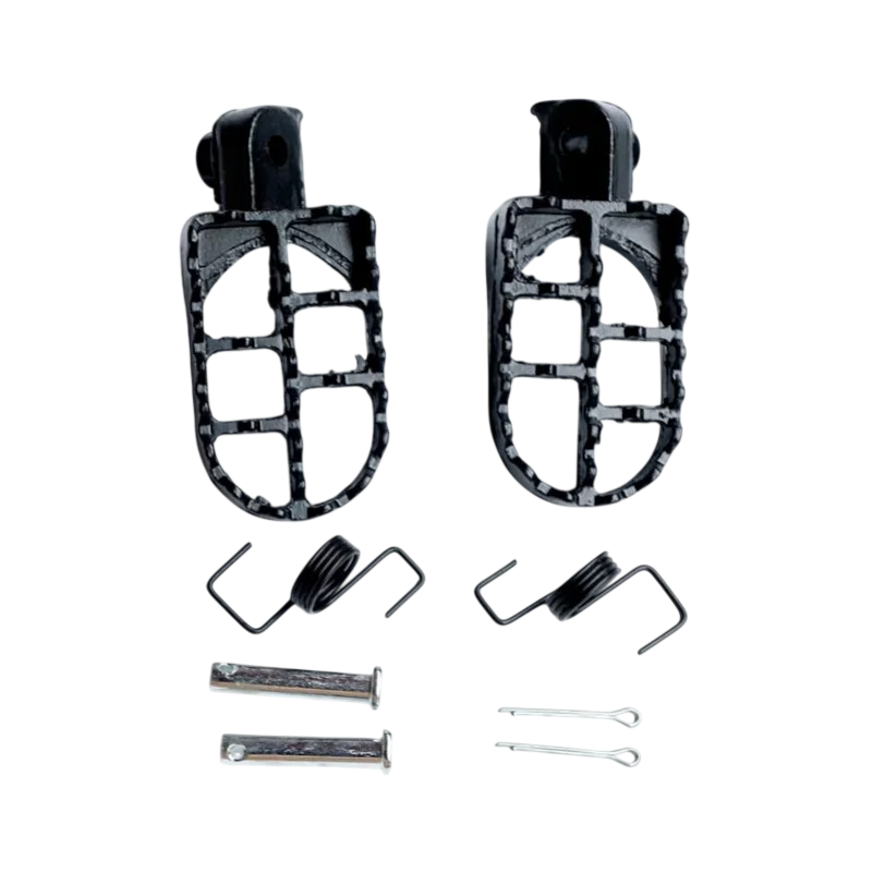 Podstawą jest stalowa konstrukcja, która zapewnia mocną i stabilną podstawę dla podparcia nóg jeźdźca. Wymiary 80 × 50 mm odpowiadają standardowemu rozmiarowi stopek w mniejszych motocyklach offroadowych i dziecięcych. Otwór montażowy o średnicy 8 mm umożliwia instalację bez konieczności modyfikacji ramy czy uchwytów. Stopki są kompatybilne z modelami Yamaha PW50, PW80, TW200 oraz Honda XR50R, CRF50, CRF70, CRF80, CRF100F, co zapewnia szerokie zastosowanie. Konstrukcja została zaprojektowana tak, aby odpowiadała powszechnym sposobom mocowania w tych typach motocykli.