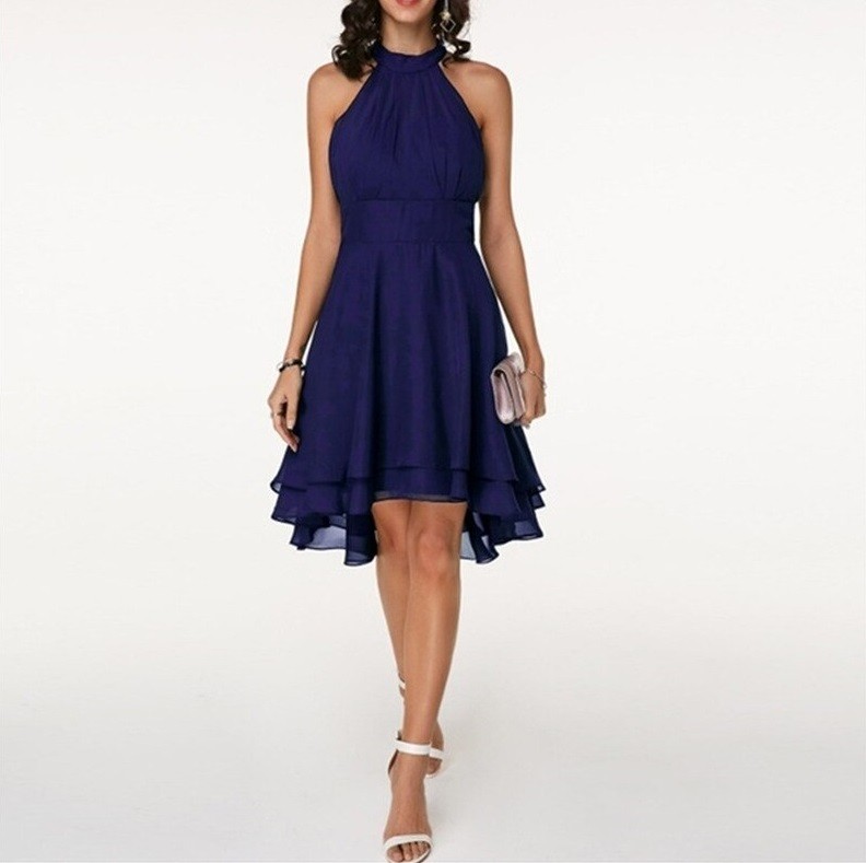 Wycięte ramiona, warstwowa marszczona spódnica.